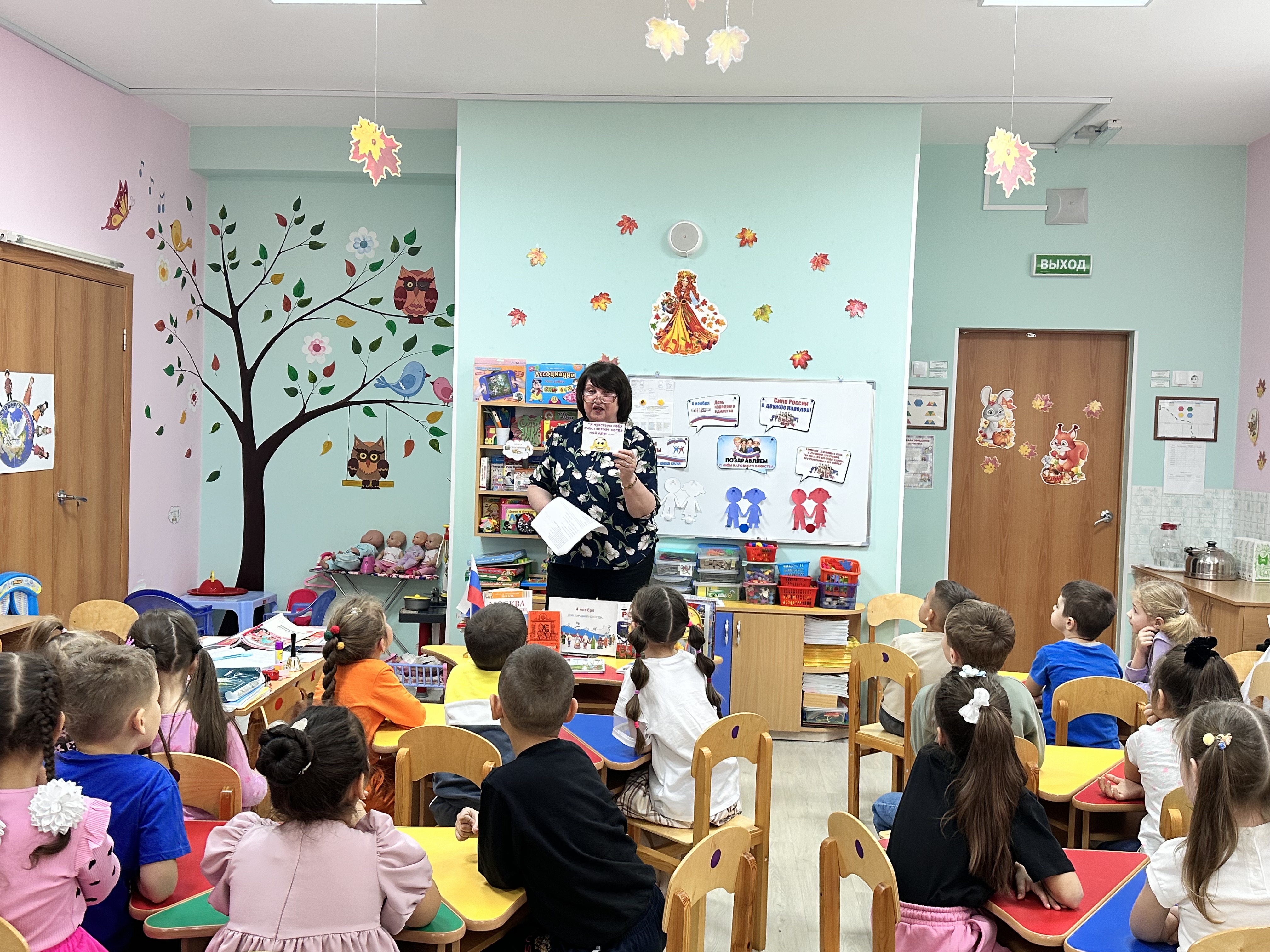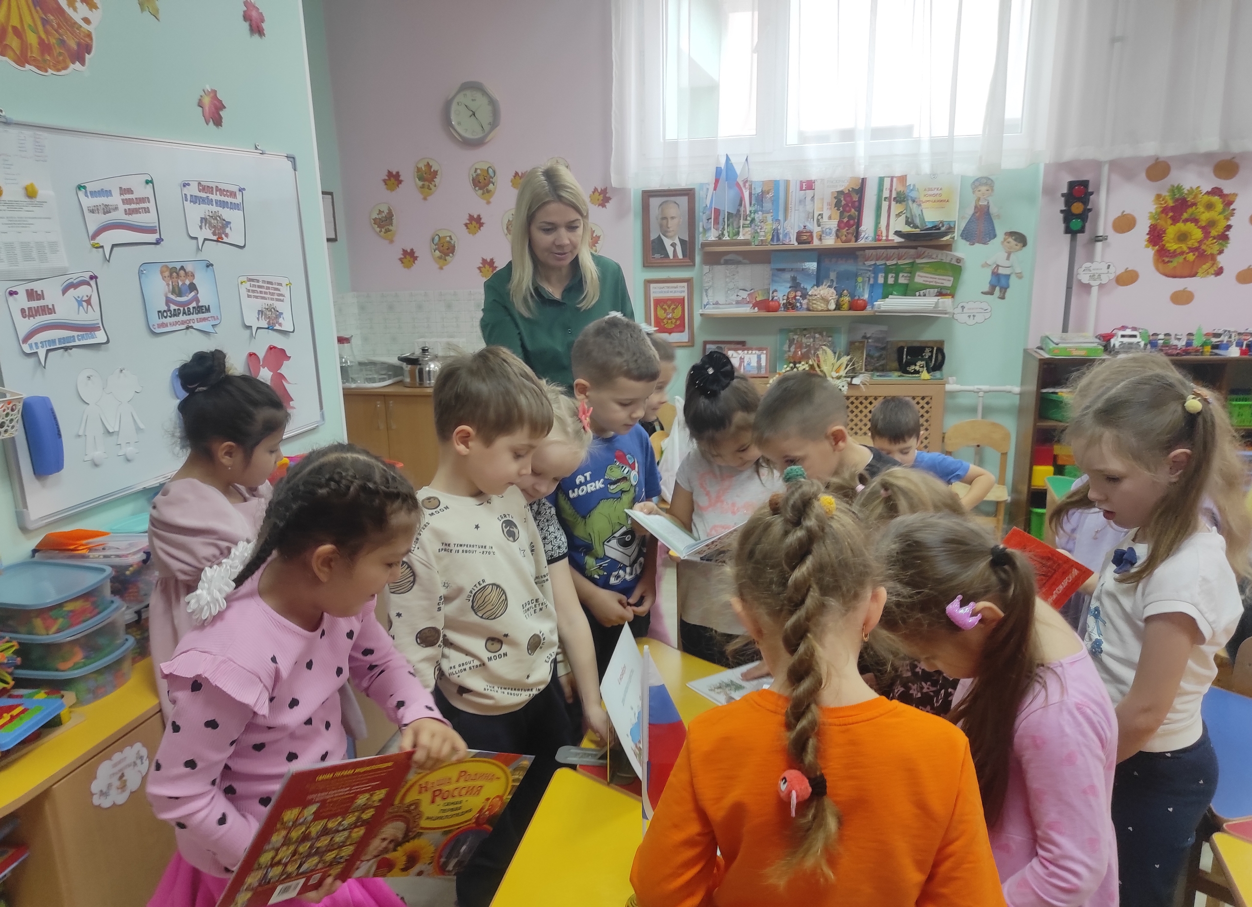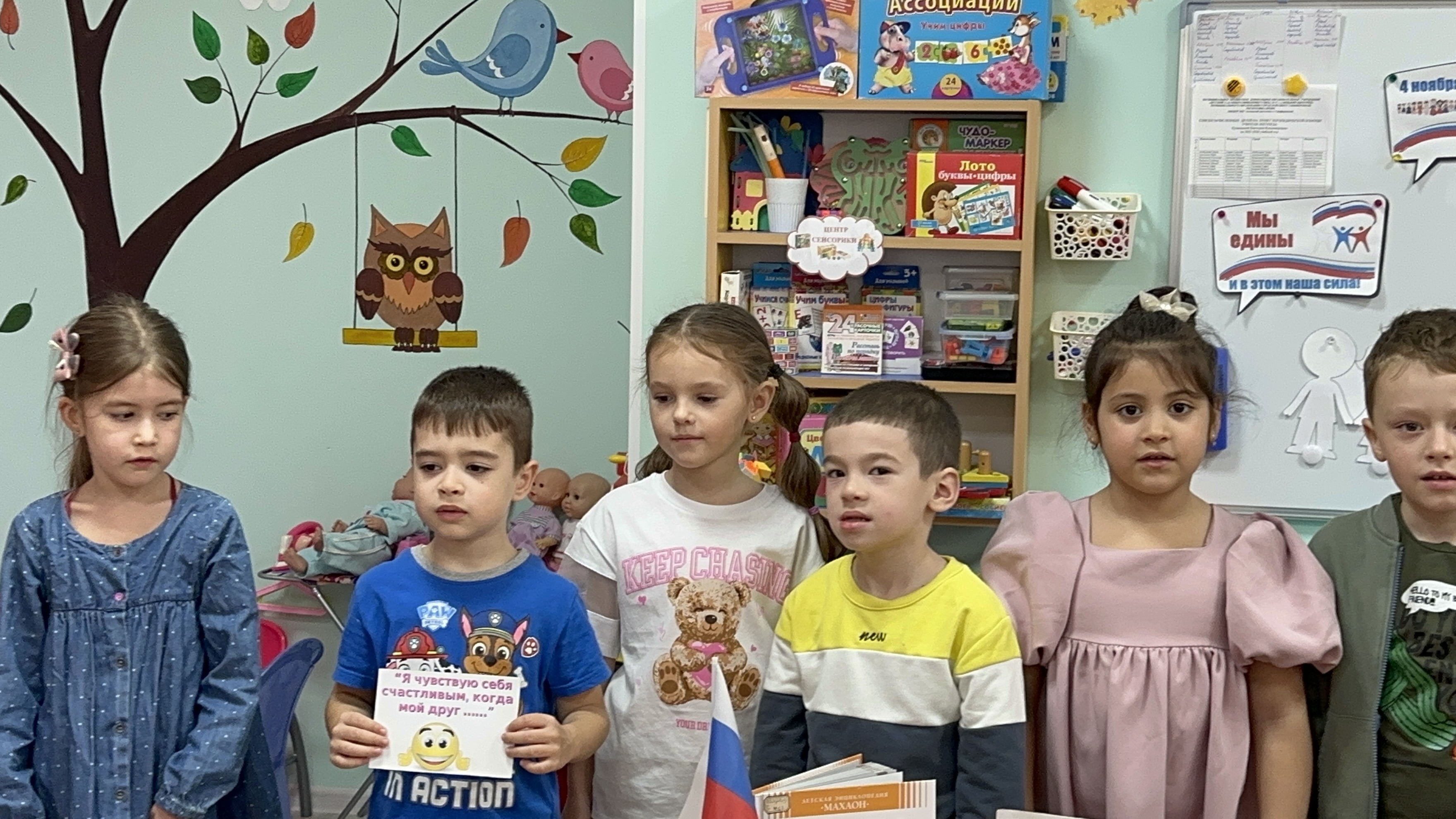 Библиотекарь познакомила детей с историей возникновения праздника. Особое внимание было уделено исторической памяти: присутствующие узнали о событиях 1612 года, когда народное ополчение под предводительством Кузьмы Минина и Дмитрия Пожарского освободили Москву от польских интервентов, продемонстрировав героизм и сплоченность всего народа. Затем ребята послушали стихи о России, назвали символы нашего государства, вспомнили пословицы и поговорки о дружбе. С удовольствием поучаствовали в играх «Умники и умницы», «Круг дружбы». А весёлая физкультминутка доставила дошкольникам массу позитивных моментов и радости.